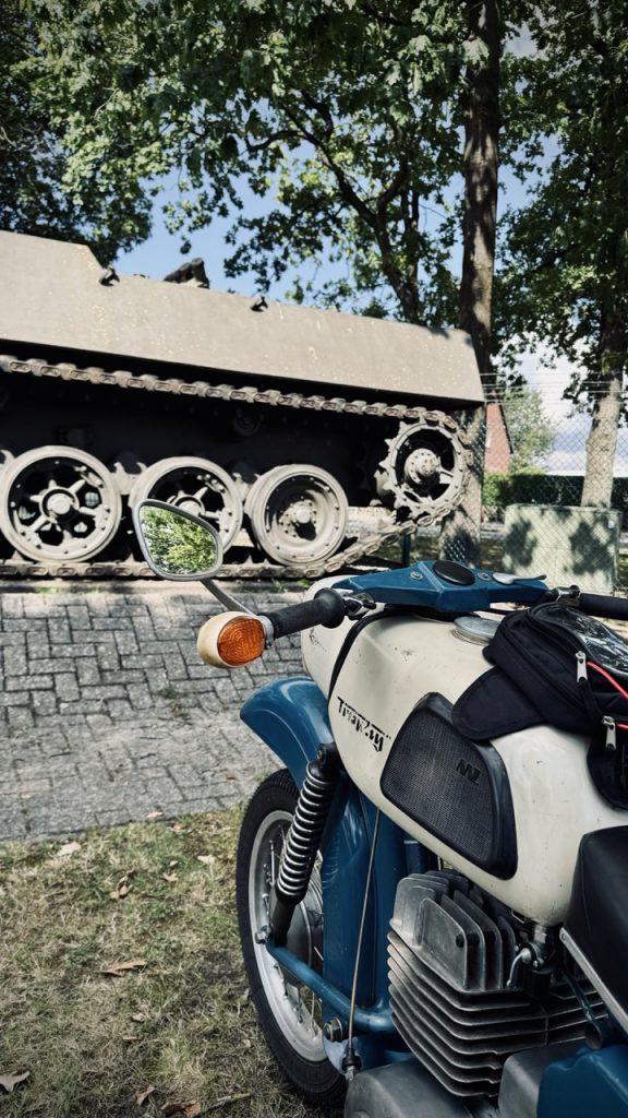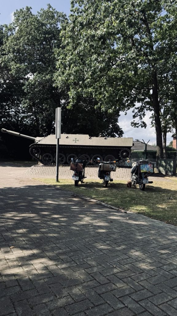 Gegen 11:00 Uhr überqueren wir bei Wittingen die ehemalige innerdeutsche Grenze. Wenig erinnert an die Grenze, nur eine Hinweistafel und ein alter Plattenweg. Ab hier führt uns die Route für mehrere Tage durch Niedersachsen. Durch die Lüneburger Heide halten wir uns an einen bewährten Rhythmus: etwa alle 30 Kilometer eine kurze Pause. Um 12:30 Uhr erreichen wir das Deutsche Panzermuseum in Munster. Die Exponate beeindrucken – technisch wie historisch. Wir betrachten sie mit Interesse, aber auch mit Demut. Gerade in geopolitisch fragilen Zeiten.