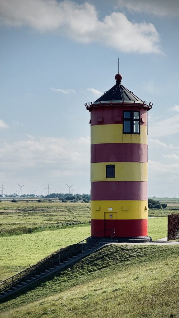 Das Wetter hellt auf, und wir fahren weiter zum Campener Leuchtturm, dann – als Tageshighlight – zum Pilsumer Leuchtturm, bekannt aus „Otto – Der Außerfriesische“. Entsprechend gut besucht ist der Deich. Wir spazieren entlang der Kante, blicken über das flache Land und stellen erneut fest, mit welcher Konsequenz die Ostfriesen ihre Landschaft über Jahrhunderte geformt haben. 😉