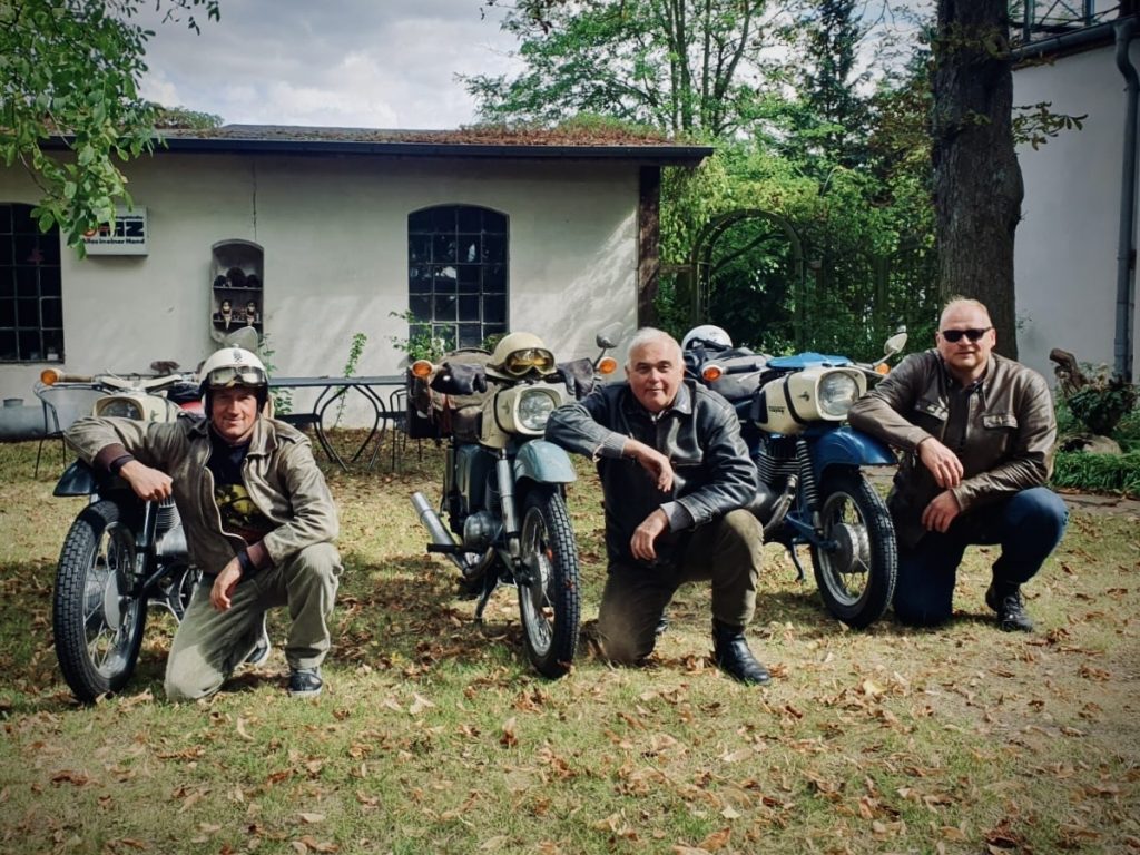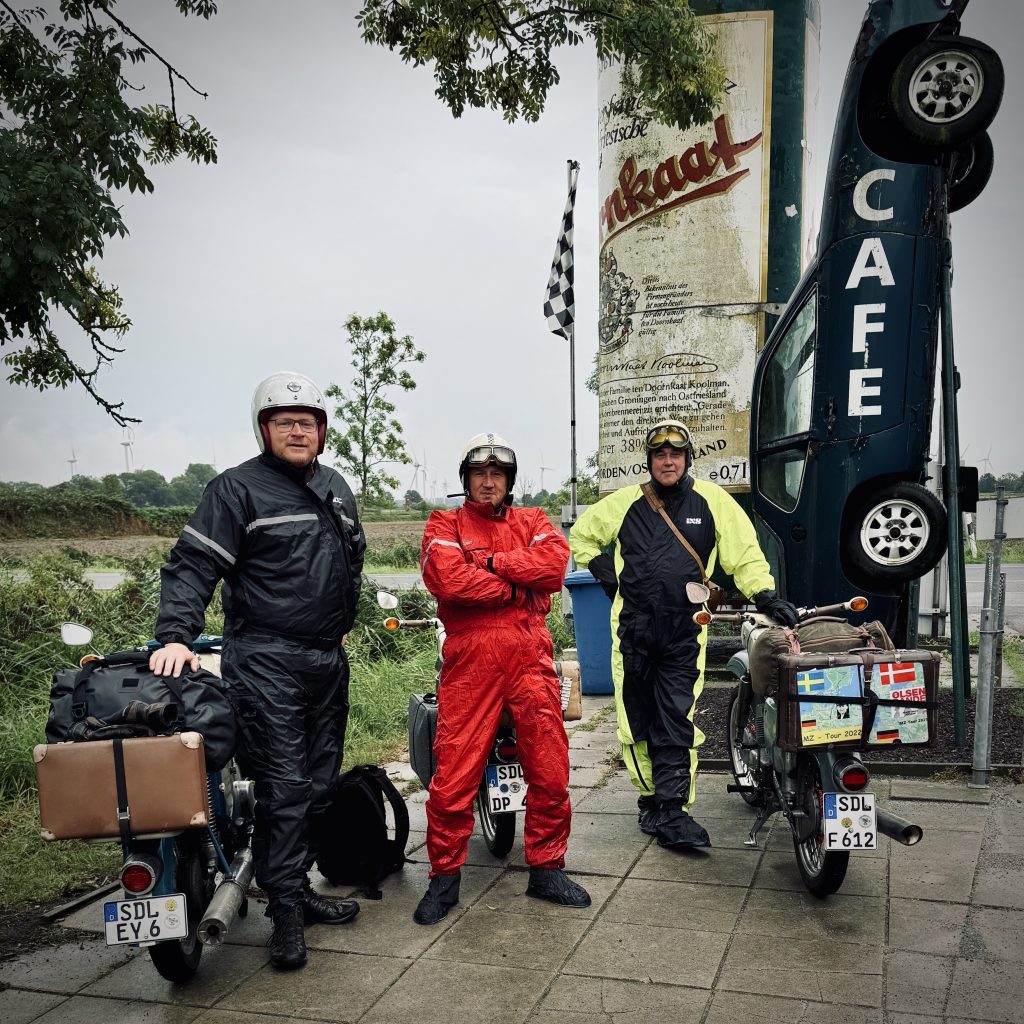 Kurz vor der vereinbarten Uhrzeit treffen wir uns am Startpunkt. Da die Route gen Westen führt, sind Poldi und Detlef direkt in Tangermünde aufgebrochen, Manuel stößt ein paar Kilometer weiter westlich dazu. Dort stehen sie nun nebeneinander: drei Maschinen, drei Fahrer, ein gemeinsames Ziel. Zweitakt in Reinform.