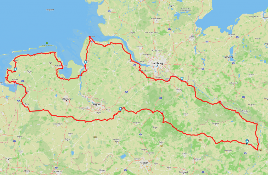 Der 1. September beginnt mit ostfriesischem Originalwetter: Regen, Wind, kühle Temperaturen. Nach einem ausgiebigen Frühstück beobachten wir das Regenradar und verschieben die Abfahrt um 30 Minuten. Doch mit rund 250 Kilometern vor uns bleibt wenig Spielraum. Also Regenkombi an und los.